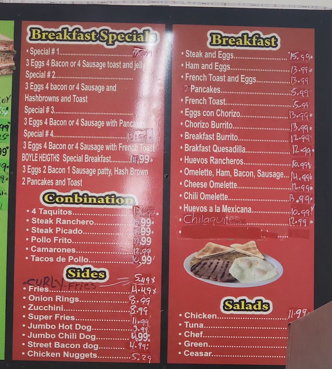 At Boyle Heights Super Burgers, you’ll find a menu that’s all about satisfying cravings with delicious and hearty meals. Whether you’re in the mood for a classic burger, loaded fries, or something a bit more unique, this spot has something for everyone. Their signature burgers are stacked high with fresh ingredients, from juicy beef patties to crispy bacon and all the tasty fixings. Don't miss out on their mouthwatering sides - the fries are perfectly seasoned and make the perfect companion to any meal. For those who like to switch things up, there are plenty of options to customize your burger to fit your taste. With its casual vibe and a menu that brings comfort food to the next level, Boyle Heights Super Burgers Menu is the go-to for a satisfying meal any time of the day.